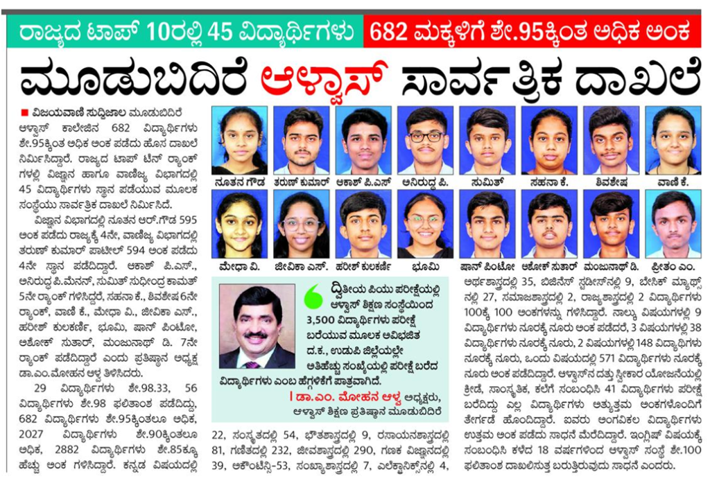 Alva’s Pre University College started its historic journey in 1998 with the vision of moulding a better tomorrow. Today, Alva’s has not only become a household name, but also a synonym for excellence, expertise, eminence and efficiency. Alva’s P.U College has stood out to be a very special educational institution having carved a niche for itself in a short span. In the course of fulfilling its vision, the college has made remarkable achievements and emerged as one of the premier institutions of the nation.