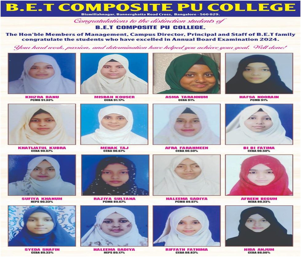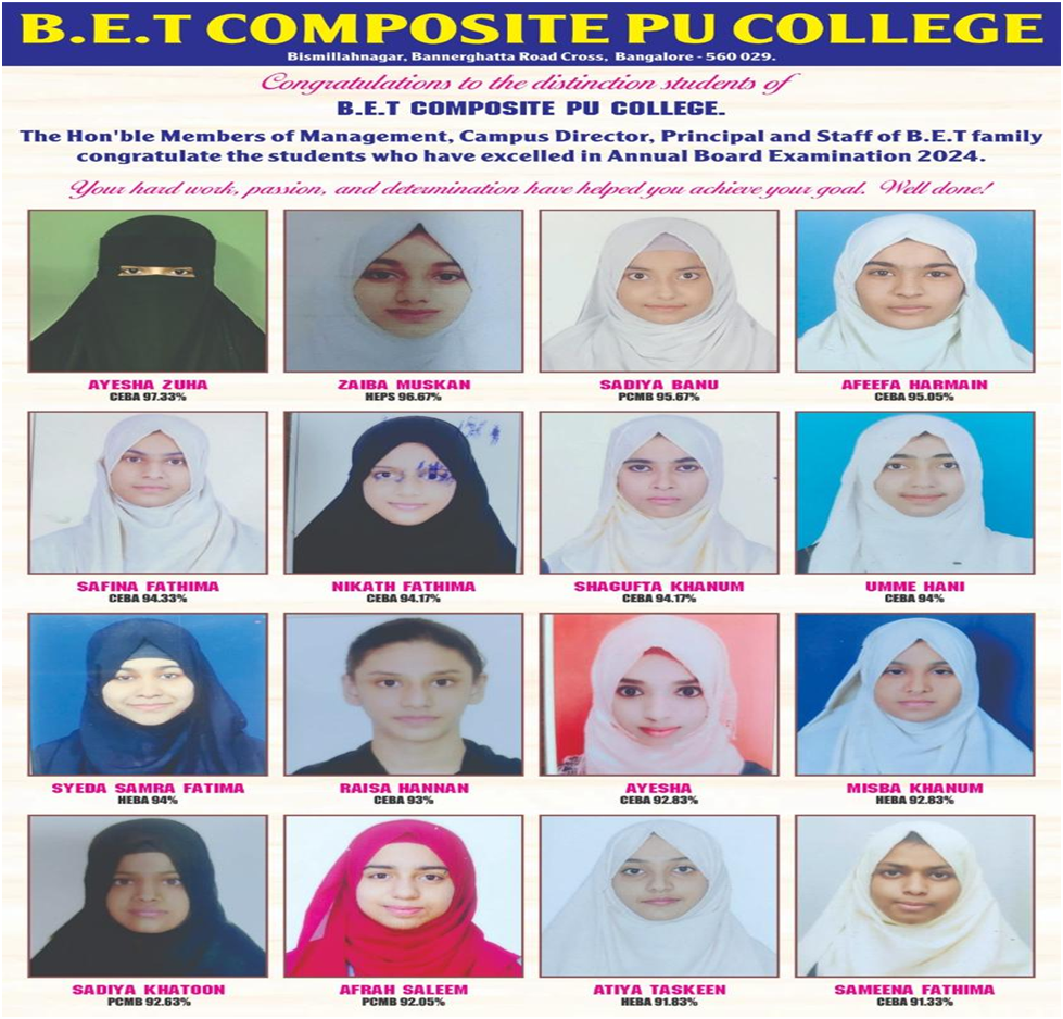 In the year 1994, BET Composite PU College for Girls was established and inaugurated. Alhamdulillah, PUC is growing strong day by day since the inception.