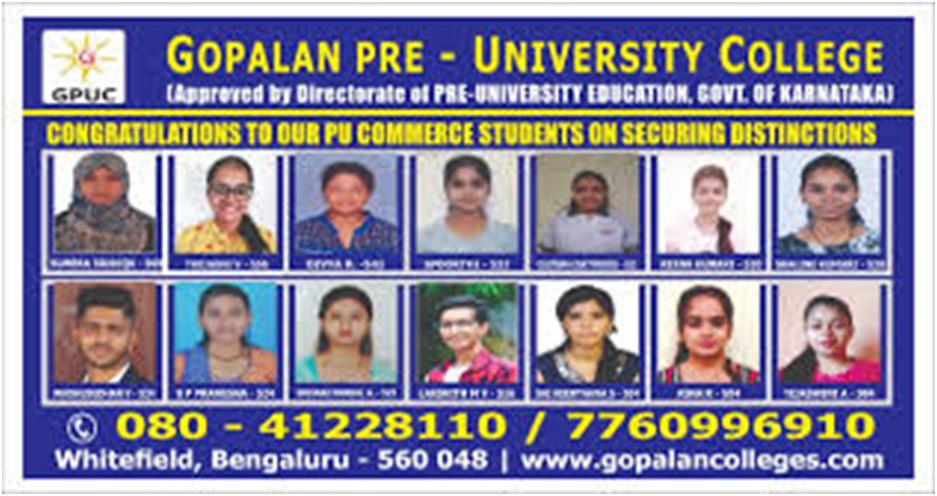 Gopalan Pre-university college under the Directorate of Pre-university education in Bangalore, Karnataka and approved by the Government of Karnataka had its beginning in the Academic Year 2012-13, to offer Inclusive Commerce & Science Education. It is considered to be one of the best PU colleges in Bangalore.