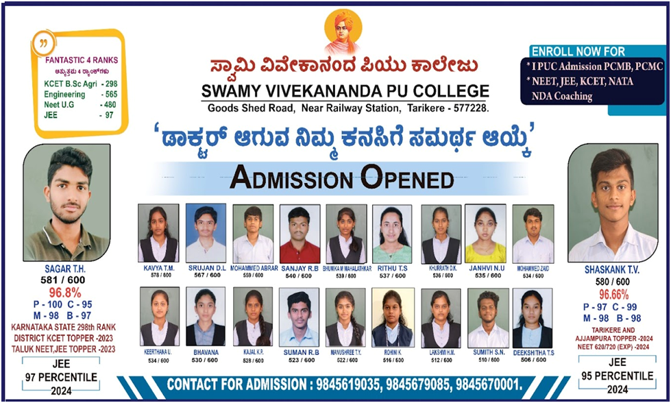 Swami Vivekananda PU College Having good quality staff’s. Providing NEET, JEE, CET coaching.
