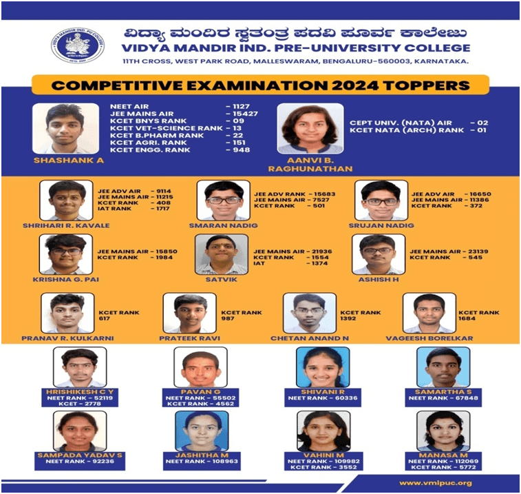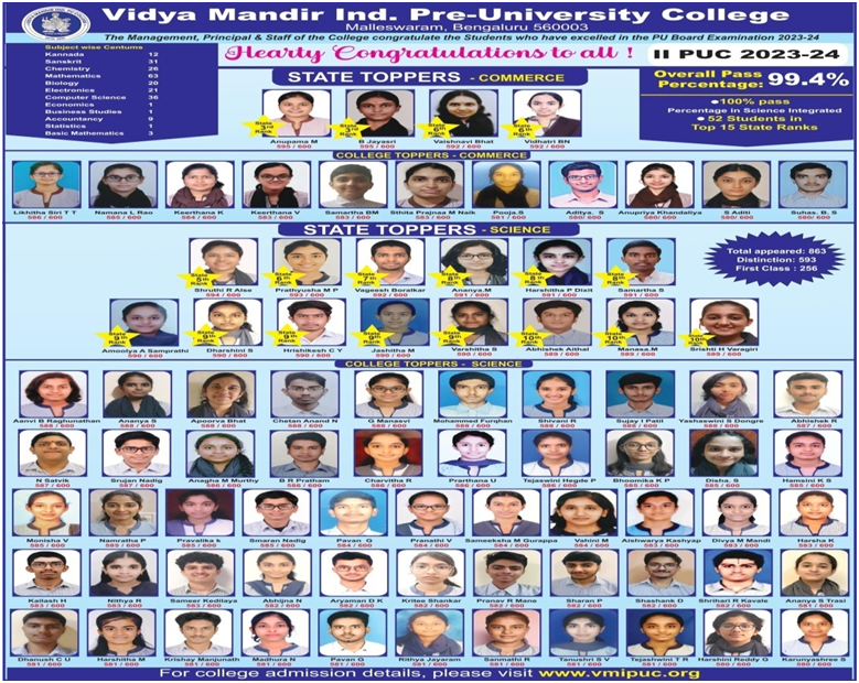 Vidya Mandir Ind. PU College came into being in the year 2001 with a modest strength of hundred students and nine lecturers. Initially, two options were offered in the Science stream- PCMB and PCMC. Subsequently, the Commerce stream was included. PCME in science stream was introduced, after witnessing a surge in the demand for the same.