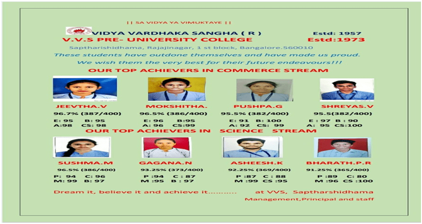 Welcome to VVSPU College. Today we stand on the threshold of 47 years of glorious history to impart world standard education to the students with par excellence. VVS is a jewel in the crown of educational institutions of Rajajinagar area. The very ethos and ambience prevailing in this institute is based on Indian cultural values and very pleasing to all. The mere name VVS signifies a lot who have passed through the portals of this great institution.