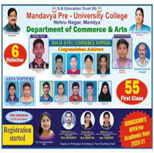 Mandavya PU College is headed by Chandrashekar an eminent scholar and popular teacher. His dedication and commitment to students has given the right attitude and right understanding and uplifted hundreds of students to great heights in the strata of life.The college strength has increased significantly during the last 3 years. The College management has met all the basic necessities by providing spacious classrooms, adequate furniture , good library, laboratories and a computer lab.15 students gold distinction and gold medals from the Management.The college has also taken steps to provide clean drinking water, canteen and a vehicle stand.In accordance with the regulations of PU board unit test, monthly tests, mid-term and preparatory exams are conducted. It is mandatory for students to attend all these tests and examinations. Progress report of all these will be sent to the parents/guardians.In accordance with the regulations of PU board unit test, monthly tests, mid-term and preparatory exams are conducted. It is mandatory for students to attend all these tests and examinations. Progress report of all these will be sent to the parents/guardian.