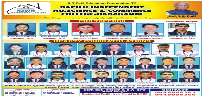 Bapuji Independent P U College” is approved and recognised by the PreUniversity Board/Department of Pre-University Education, Government of Karnataka, India and is a grade ‘A’ PU College established in 2012 and situated in a beautiful and vibrant campus of 23 acres at Badagandi, Bilagi Taluk, Bagalkot. A Pre-University