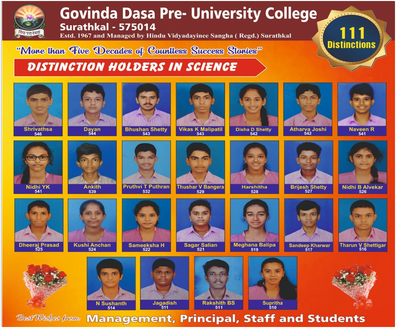 Govinda dasa pre-university college is an educational institution ,impating knowledge related to arts, scienece and commerce at pre –university level. It is one of the premier educational institutions of renowned vidyadayinee group of educational institutions, propagating knowledge and edifying the student community.the hindu vidyadayinee sangha which manages the vidyadayinee educational institutions was estrablished on -30-11-1916 at iddya sri mahalingeshwara temple, iddya, surathkal.with the lofty goal of ‘vidya para devathaa’ the iddya vidyadayinee school originated and intiated the nobel task of conferring education to the students of the surrounding started by the local teachers and the philomaths, has been useful to the students of the surrounding areas from the date of inception. In1994. Vidyadayinee school and in 1967 with the permission of mysore university, govinda dasa college was started with the help and co-operation of the local people.