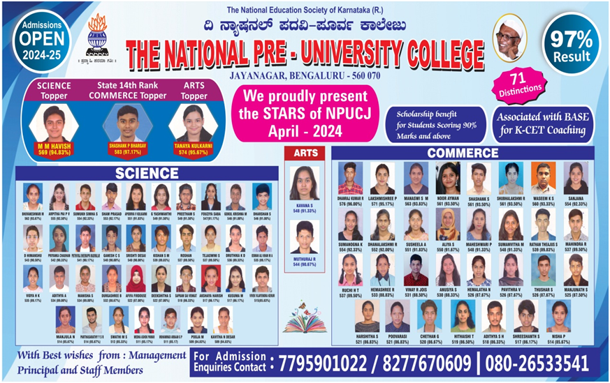 The National Pre-University College, Jayanagar is one of the twenty institutions being managed by the National Education Society (NES) of Karnataka. The NES of Karnataka was established in 1917 with nationalist ideals as its driving force. Although the college began with a strength of 110 students in the Pre-University course, now it has grown into a one of the leading institutions in the heart of the city with a strength of more than 1300 students and 70 faculty members.The College offers various combinations in Science, Commerce and Humanities. The college has well furnished and spacious class rooms, well-equipped laboratories, and a library with the latest collection of journals, profound books on various subjects and a vast sports field.The institution aims at nurturing cultural activities for which the Bangalore Lalithakala Parishath was established. A well maintained auditorium, H.N.Kalakshetra is in place to conduct all the cultural activities. Under the Bangalore Lalitha kala Parishath, the college organizes cultural programmes in Dance, Music and Dramatics by eminent artists on every Friday of second and third week of the month. Since 1992, about 869 Cultural Programmes have been organized. Music competitions and Intersection Drama Competitions are organized to nurture artistic talent of the students in classical music and dramatics to help the students not only to have all round personality development but also to provide a platform for the students to improve their skills and interact with the performing artists.B.V. Jagadeesh Science Centre, Bangalore’s complex for museum, library, research and education was established by the National Education Society of Karnataka [NES] in 2001 not only to popularise science but also to stimulate curiosity and inspire science learning among the students because we value science as an indispensable tool for understanding our world and enriching people’s lives.The college is proud to have a large number of alumni who are well established in various fields such as IT, BT, Medicine and Basic Sciences. Many students of the college are also serving as IAS and IPS officers. Quite a good number of students are celebrities in theatre and in sports.The college has a team of well qualified, experienced, competent and dedicated faculty members well supported by the management. The faculty encourages and inspires the students to put in their best to excel in their field of interest. The faculty strives hard to train the students to reach greater heights not only academically but also for their holistic development inculcating values of life. The college aspires to become a centre of excellence of learning.