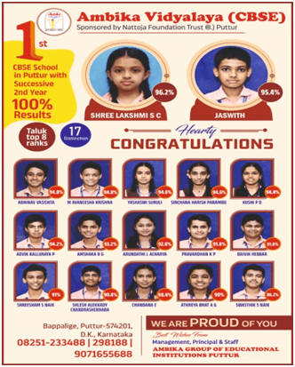 Ambika Vidyalaya was founded on 05th May 2014 by Sri. Subramanya Nattoja, Correspondent & Mrs. Rajashree S Nattoja, Treasurer of Nattoja Foundation Trust ®. The Campus is situated at Bappalige Road Puttur. The school is affiliated to Central Board of Secondary Education, Delhi (Affiliation No. 831094 and School No 46726 and offers education from LKG to X. This Co-educational Institution provides better education facilities with emphasis on “Sadrida Bharata”, hobbies and sports. The endeavour is to encourage students in vigorous pursuits of excellence, both in sports and studies so as to embark on the journey of adulthood with confidence.