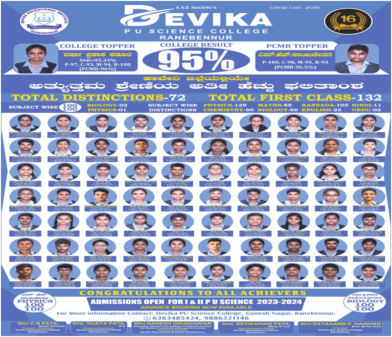 Devika PU Science is a leading coeducational institution offering high quality education for Pre-university Science Students in Haveri District. The institution is a part of Devika English and Kannada Medium School registered under Shri. Venkateshwara Education Society, Ranebennur.