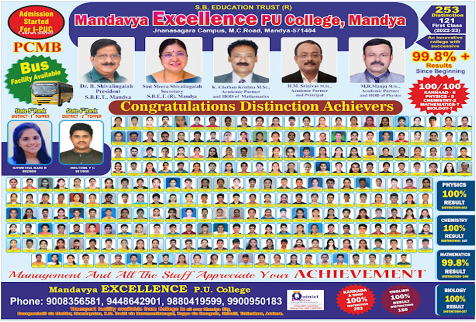 Mandavya Excellence PU College is headed by Sri H M Srinivas, K Chethan Krishna and M R Manju under S.B Education Trust. The Principal of the institution Sri H M Srinivas is an eminent scholar and popular teacher. His dedication and commitment to students has given the right attitude and right understanding and uplifted hundreds of students to great heights in the strata of life.The college strength has increased significantly during the last 3 years. The College management has met all the basic necessities by providing spacious classrooms, adequate furniture , good library, laboratories and a Computer lab. The college has also taken steps to provide clean drinking water, canteen and a vehicle stand.In accordance with the regulations of PU board unit test, monthly tests, mid-term and preparatory exams are conducted. It is mandatory for students to attend all these tests and examinations. Progress report of all these will be sent to the parents/guardians.In accordance with the regulations of PU board unit test, monthly tests, mid-term and preparatory exams are conducted. It is mandatory for students to attend all these tests and examinations. Progress report of all these will be sent to the parents/guardians.