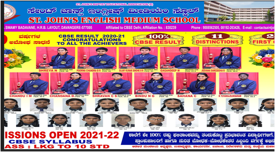We, St. John’s English Medium School at in Davangere, KARNATAKA, believe in providing academic excellence to our students. In order to achieve this we have a team of dedicated teachers who channelize their energy and resources towards child-centered qualitative learning. We help students gain a strong foundation and develop into holistic beings. During these years, the smooth transition from childhood to adolescence is facilitated by value-added education. We focus on building a strong foundation for learning and developing the young minds. Providing high-quality education – right from preschool – is our goal and commitment. While learning comes naturally to children with simpler teaching methods, we facilitate and build on this newly developing ability. We pride ourselves in taking the initiative to give something back to society and imbibing utmost knowledge and compassion in our students.