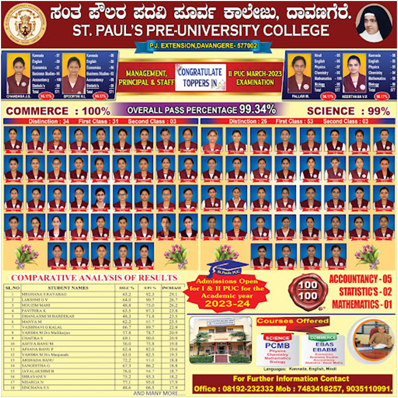 We are proud of the fact that St. Paul’s is the only Pre-University College in the Davangere District to hold intercollegiate Science and Commerce exhibition with working models and host a Cultural Fest with a difference. Folk art and folk songs are an integral part of learning. Students learn Janapada, Bhavageethe & classical music. Yoga and other exercises of physical fitness are a daily feature.