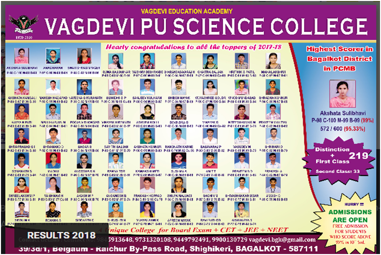 Bagalkot is one of prestigious education centres in North Karnataka. It is enjoying this status for many years by the virtue of its nature to respond to the growing needs of education field. “Teacher managed institution” is a contemporary concept in the era of competition. In view of this novel concept a group of experienced and expert teachers started VAGDEVI EDUCATION ACADEMY in 2010 and VAGDEVI P.U SCIENCE COLLEGE IN 2011 With the idea of training PU students for not only Board examinations but also entrance tests like NEET, CET, JEE….etc. In the last 7 years, thousands of students have been trained successfully and many of them have achieved great excellence by getting admitted to institutions like NITs and IITs. From the last 4 years the institution is also running High School and Primary school to give value based education to the children.