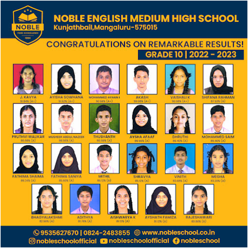 The Noble School, Kunjathbail, Mangalore 575015 was started by Islamia Educational Trust (Regd.) Mangalore 575015 in the year 1994 and has become a fully fledged institution imparting education from Lower Kindergarten to Tenth Standard, as per the Karnataka State Board education pattern. It was a challenging task for the institute to bring up the school by understanding the need of quality education for the lower economy people in the competitive world. In the initial stage it was started as a plant with few students for kg section, later on with the efforts of the management as well as the staff now it has come out as tree with different branches like KG, PRIMARY as well as HIGH SCHOOL sections. Now the strength of school has reached to 780 students in the past 20 years.