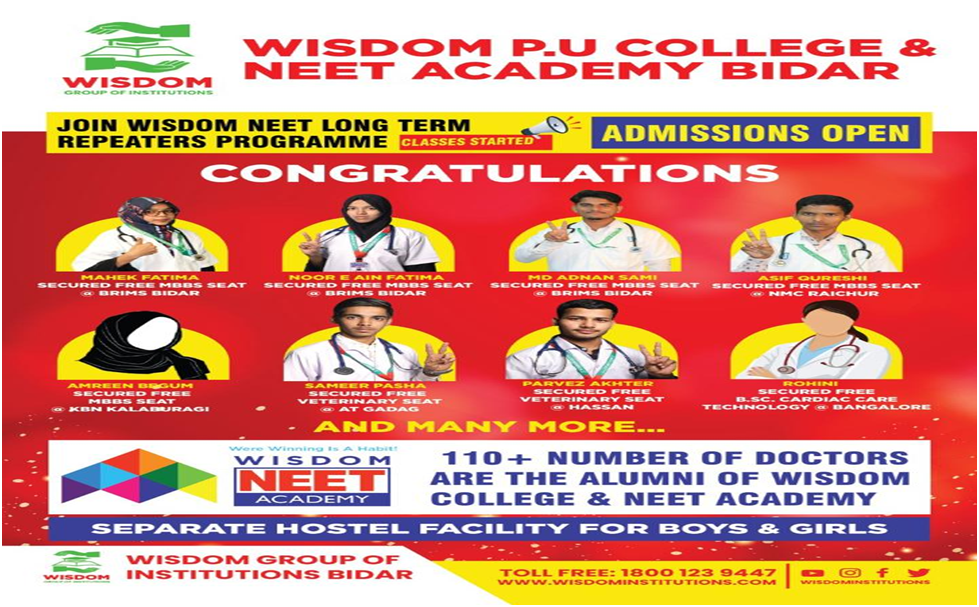 In this confused and turbulent situation to fill the existing vacuum, to fill the long cherished dreams of worrying parents and to bring back the lost glory of Bidar, that was during the period of University of Mahmood Gawan a team of dedicated intellectuals from the field of education with vast hands on experience and with tremendous paraphernalia has stared Wisdom PU College under the management of Talent Promotion Trust (R) Bidar, with the sole aim of imparting quality education and inculcating best character and discipline in our young generation.