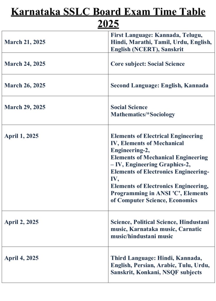 Karnataka SSLC Board Exam Time Table 2025